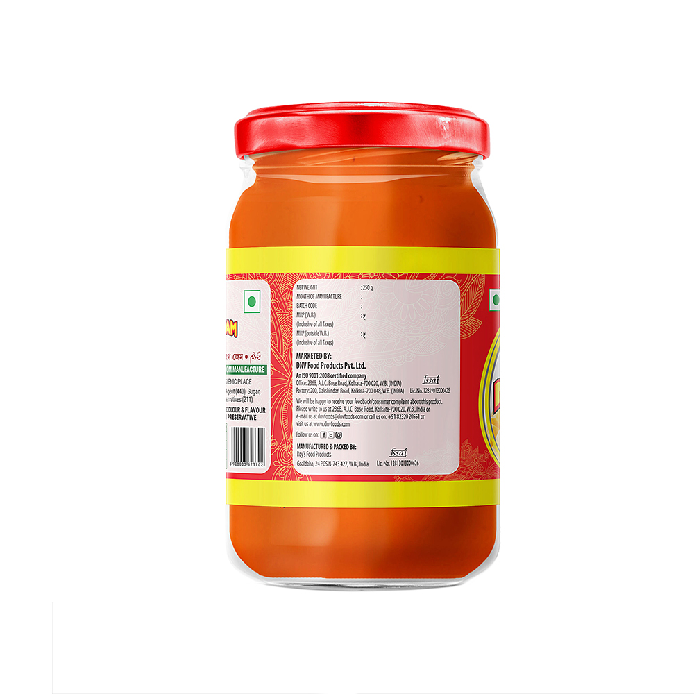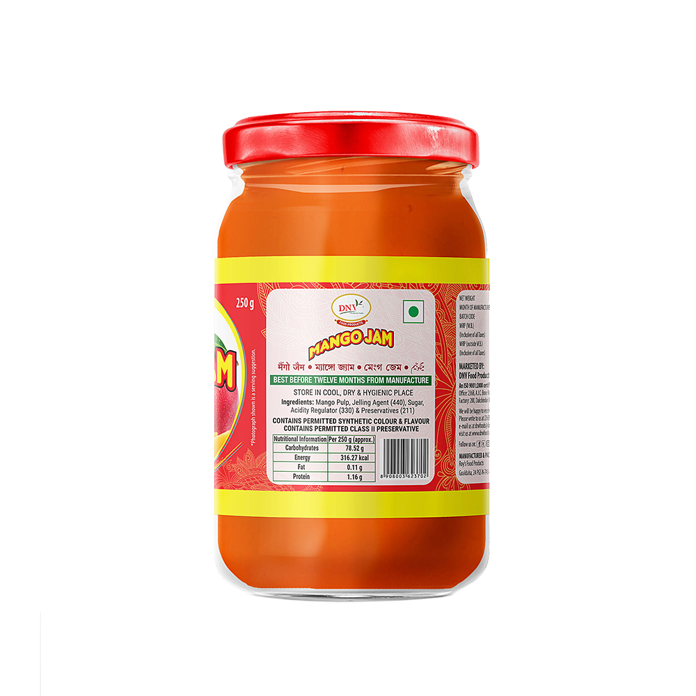 Packaging & Sizes: At DNV Food Products Pvt Ltd, the premium quality mangoes used in the mango jam are completely pure and natural. The Jam is packaged as per FSSAI certification keeping in mind the regulations.The jam packaging bottles are hygienically packed with care. It is preferable to consume the product within 12 months from the date of manufacturing to get best results on your health! Our Mango Jam is available in different sizes  250gms & 500gms bottle.